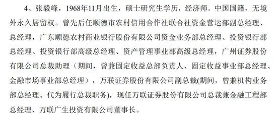 由东兴证券担任主承销商,签发于今年2月的《万联证券2024年面向专业投资者公开发行公司债券(第一期)募集说明书》,列出了董监高履历。