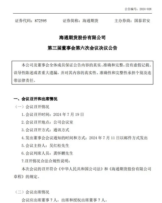 第三届董事会履职刚满半年,海通期货股份有限公司(简称:海通期货)在7月19日召开了第六次会议。