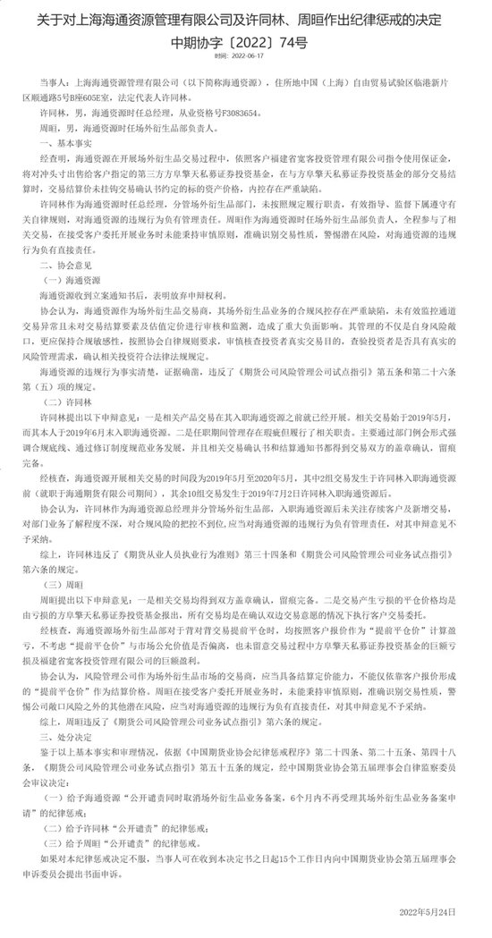 2022年5月,中国期货业协会对海通资源下发中期协字中期协字〔2022〕74号决定。经查明,海通资源在开展场外衍生品交易过程中,依照客户福建省宽客投资管理有限公司(简称:宽客投资)指令使用保证金,将对冲头寸出售给客户指定的第三方方阜擎天私募证券投资基金,在与方阜擎天私募证券投资基金(简称:方阜擎天)的部分交易结算时,交易结算价未挂钩交易确认书约定的标的资产价格,内控存在严重缺陷。