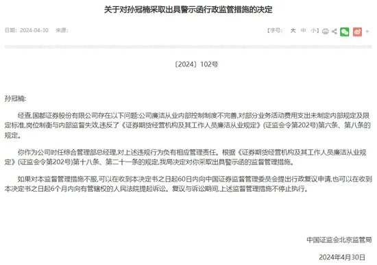 因对国都证券“廉洁从业内部控制制度不完善,对部分业务活动费用支出未制定内部规定及限定标准,岗位制衡与内部监督失效”三项违规负有管理责任,北京证监局在今年4月30日同时“追罚”了时任综合管理部总经理孙冠楠,对其采取监管警示措施。