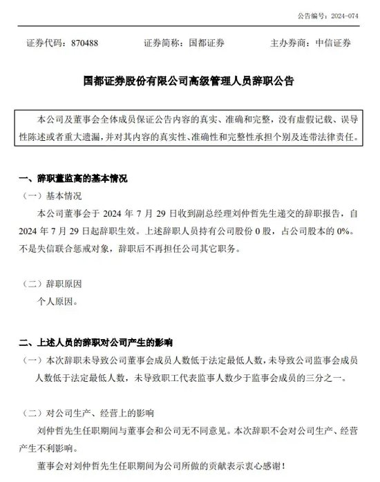 在分红公告发布当天,国都证券副总经理刘仲哲因个人原因提交辞呈,辞职后不再担任公司其它职务。国都证券董事会对其任职期间为公司所做的贡献表示衷心感谢。