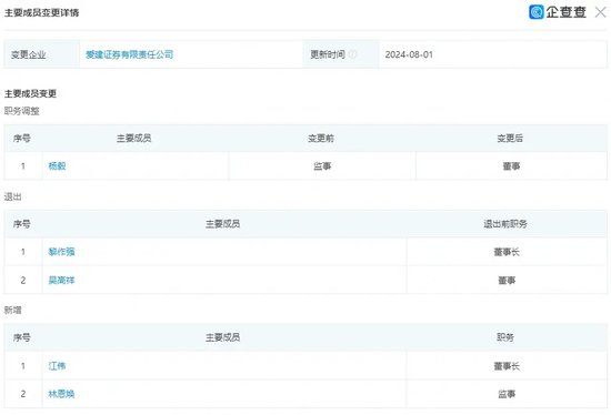 8月1日,爱建证券完成工商变更,董事长由“黎作强”变更为“江伟”。