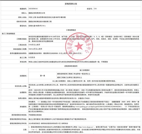这一项目名称为“爱建证券前滩总部大楼装修工程”,地址赫然写着“前滩大道199弄5号”。