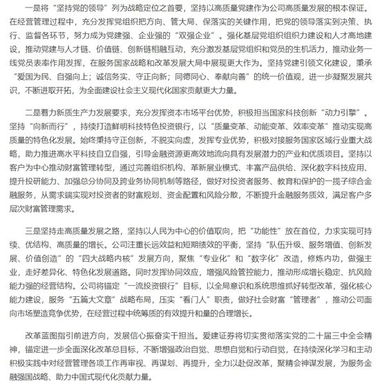 月前,证券日报专题报道了爱建证券学习贯彻党的二十届三中全会精神的心得体会。其中,“一流投资银行”目标,让行家深感敬佩。