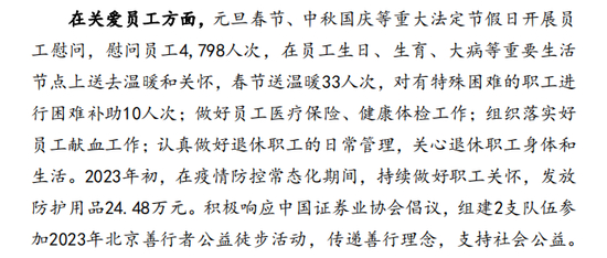 要知道,上海证券2023年报中,特别提到对外的公益活动,对内的慰问关怀,“送温暖”和“困难补助”情况。部分案例出现在中证协近期发布的《2023年度证券公司履行社会责任情况报告》中。