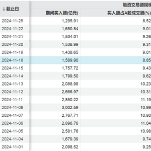 从A股市场融资余额规模来看,Wind数据显示,截至11月25日,A股市场融资余额报18267.63亿元,为2015年7月以来的高位水平。9月24日以来,融资买入额占A股成交额比重相比之前明显增加,最高的一天出现在10月8日,达11.67%。11月18日以来,融资买入额占A股成交额比重降至9%左右。