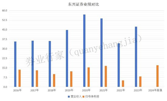 事实上,东兴证券已经连续两年业绩大增。2023年营业收入47.35亿元,同比增长38.08%;归母净利润8.20亿元,同比增长58.50%。如果以本期预告高值(17亿元)计算,2024年业绩将超过2021年(16.52亿元),成为2016年以来的历史新高。