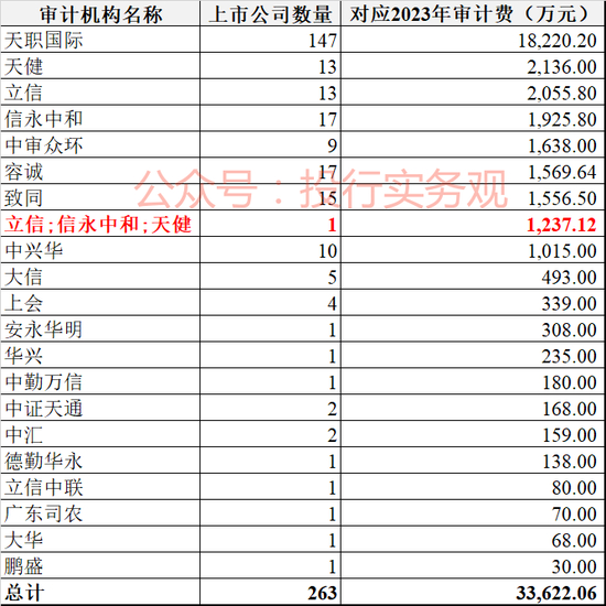 据投行实务观统计,2023年天职国际的A股审计客户约有263家,合计审计费3.36亿元;如果以2023年A股年审客户为参考来对比,暂停6个月执业的期间,约有116家A股上市公司宣布解聘天职国际,聘任其他机构担任2024年年报审计机构,这116家客户对应2023年审计费约为1.54亿元。