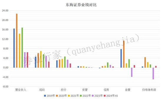 2024年上半年,东海证券业绩难说好转:营业收入5.90亿元,同比下降8.42%;净利润3187.62万元,同比下降52.44%。其中,自营业务揽收1.03亿元,同比降幅达53.64%。而投行业务当期出现了27.61%的增幅,并且近年来整体表现相对稳定。
