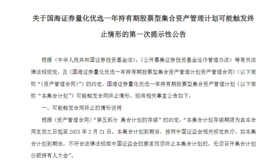同日,国海证券量化优选一年持有期股票型集合资产管理计划也发布清盘提示。
