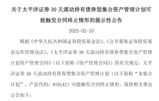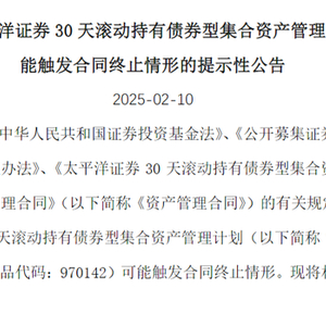 2月10日,太平洋证券披露公告,提示太平洋证券30天滚动持有债券型集合资产管理计划可能清盘。