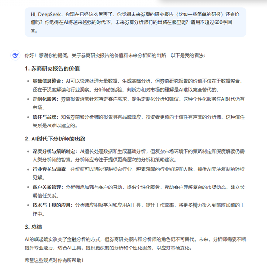 但DeepSeek也表示,未来的分析师需要适应技术变革,与AI协作,专注于高附加值的任务。“在这个AI越来越强的时代,分析师的核心竞争力将更多地体现在人类的创造力、洞察力和情感智慧上。”DeepSeek表示。
