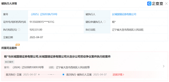 梳理案件脉络:2024年12月,(2024)辽02民终10093号劳动争议案件开庭审理。原告方为杨某,被告方为长城国瑞证券及大连分公司。这起二审案件的判决结果未有公开信息。但在今年4月7日,由大连市西岗区人民法院立案执行,标的为920,531.00元。