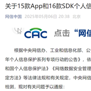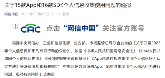 节后首个工作日,“网信中国”微信公众号刊发了题为《关于15款App和16款SDK个人信息收集使用问题的通报》。
