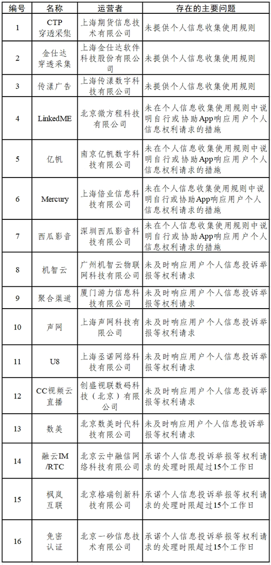 CTP穿透采集、金仕达穿透采集等16款SDK收集使用个人信息,存在未提供个人信息收集使用规则,未说明自行或协助App响应用户个人信息权利请求的措施,未及时响应用户个人信息投诉举报等权利请求等问题。