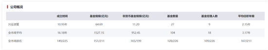截至目前,兴证资管的资产管理规模(全部公募基金)64.69亿元,排名151/211;资产管理规模(非货币公募基金)11.20亿元,排名165/210;管理公募基金数27只,排名128/226;旗下公募基金经理9人,排名109/226。