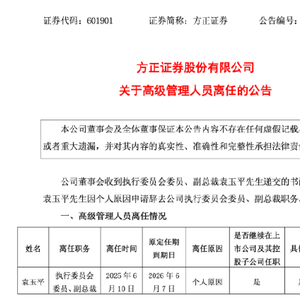 方正证券6月11日发布的公告显示,袁玉平因 “个人原因”辞去执行委员会委员、副总裁职务。相较于过往高管离任时的惯例,这份公告未对袁玉平的离开给予致谢。这位原定任期至2026年6月7日的投行掌舵人,提前一年黯然离场。