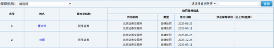 而在查看C类保代名单时,行家有了意外发现:今年6月25日,北京证券交易所对民生证券保荐代表人曹文轩、刘娜采取自律处罚措施。