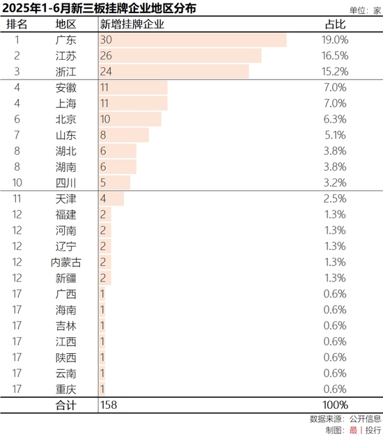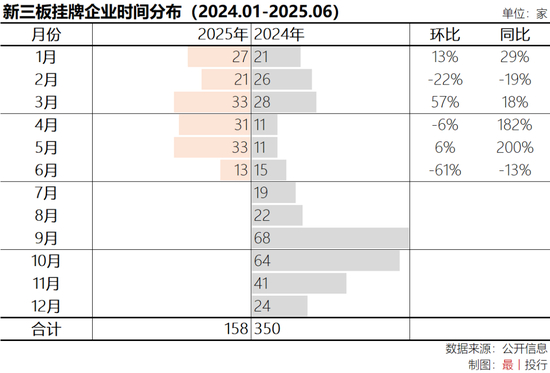 2025年1-6月,158家企业在新三板市场完成挂牌,较去年同期(112家)增加46家,同比增幅41%。其中,6月份完成新增挂牌企业13家,同比下降13%,环比下降61%。
