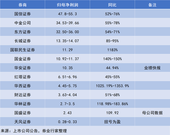 截至目前,42家A股上市券商中,华安证券已发布业绩快报;红塔证券、国联民生证券、华西证券、华林证券、财达证券、国信证券、长城证券、国金证券、东方证券、天风证券、中金公司相继披露业绩预告。