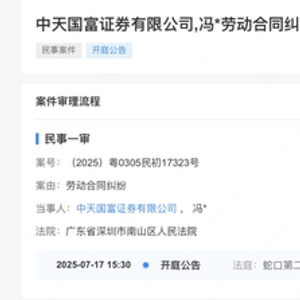 企查查显示,这起涉及中天国富证券有限公司(简称:中天国富证券)与冯某的劳动合同纠纷案,但仅显示“当事人”。