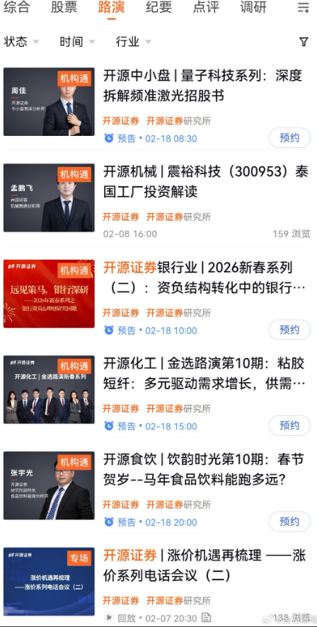 而开源证券也是不遑多让,每天都有两三场路演,同样从初一到初七都有路演。不过,开源,除夕给分析师们放了个假。