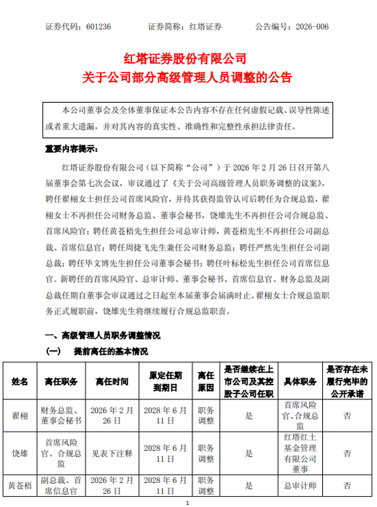 饶雄此前一直负责公司的风控与合规工作,此次调整后调任红塔红土基金董事,属于平级岗位的合理调配。为确保工作平稳过渡,在翟栩正式履行合规总监职责前,饶雄将继续坚守岗位,避免出现管理空窗,这份细致的安排,也体现出公司对治理连续性的重视。