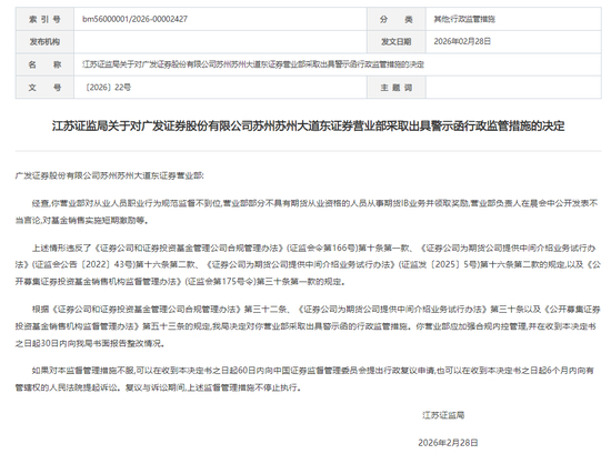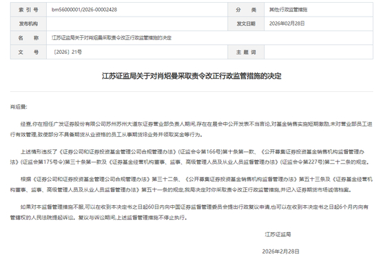 因为这些违规行为,江苏证监局采取“双罚”:营业部采取出具警示函的行政监管措施。而营业部负责人肖某曼,处罚更为严厉:责令改正,并记入证券期货市场诚信档案。