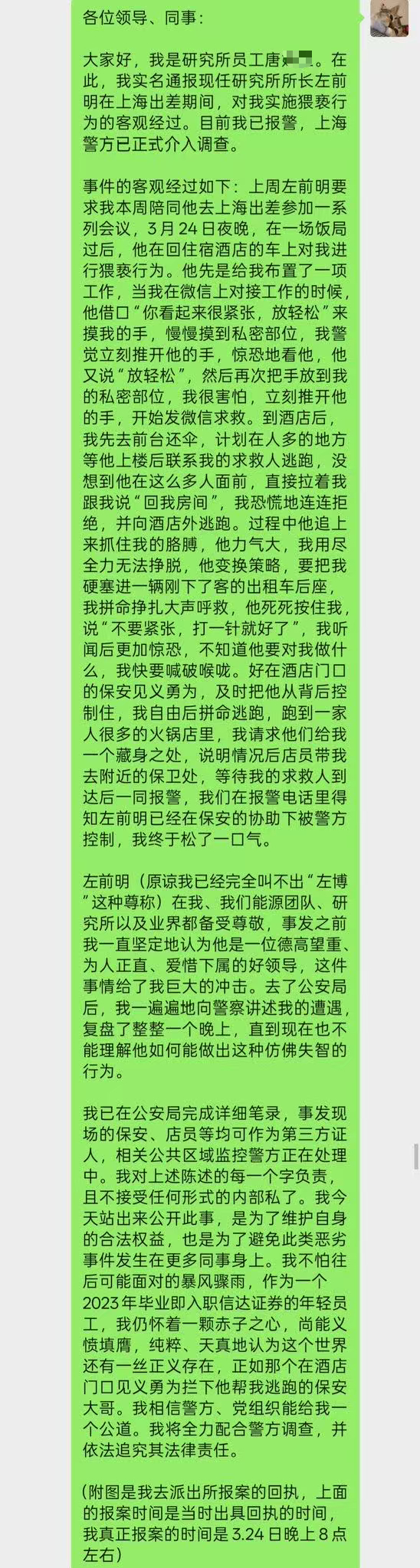 大家好,我是研究所员工唐**。在此,我实名通报现任研究所所长左前明在上海出差期间,对我实施猥亵行为的客观经过。目前我已报警,上海警方已正式介入调查。