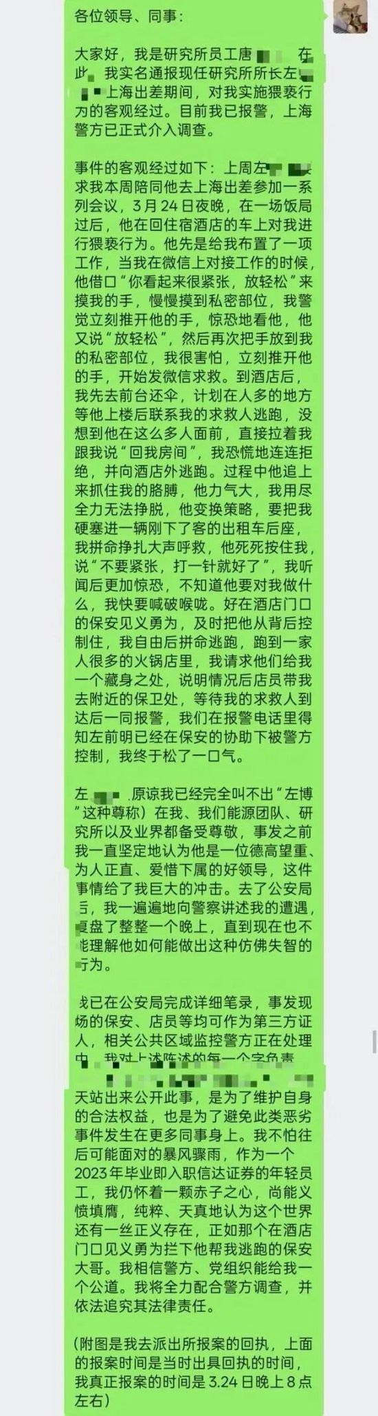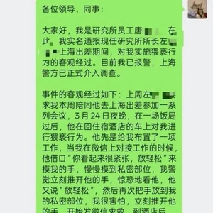 据网传内容,该下属在微信工作群中发了一段说明,内容包括:“上周左前明要求我本周陪同他去上海出差参加一系列会议,3月24日夜晚,在一场饭局过后,他在回住宿酒店的车上对我进行猥亵行为......”资料显示,3月25日凌晨,该研究员已就相关事件向上海公安部门报案。