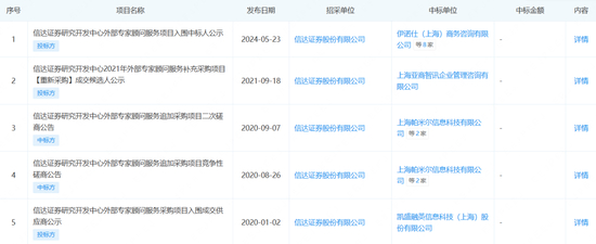 2020年1月,帕米尔首次作为投标方,出现在信达证券研究开发中心外部专家顾问服务采购项目入围成交供应商公示名单中。2020年8月,信达证券研究开发中心外部专家顾问服务追加采购项目竞争性磋商公告显示,帕米尔中标。2020年9月,信达证券研究开发中心外部专家顾问服务追加采购项目二次磋商,继续中标。