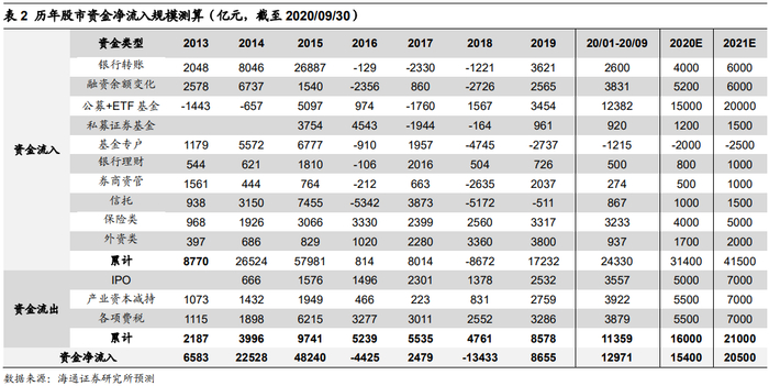 在《增量资金望超两万亿——2021年资金入市测算-20201204》中,我们提出场外的增量资金在牛市孕育期尚在观望,在爆发期后期才开始入场,在泡沫期加速涌入。本轮牛市的孕育期从19/1/04上证综指的2440点至20/03/19的2646点,期间月均资金净流入约900亿元。上证综指2646点为此次牛市爆发期3浪的起点,截止20/09/30期间月均资金净流入约1200亿元,可见从资金面的角度看19、20年基本符合牛市孕育期和爆发期的资金入市特征。今年前三季度股市资金流入项合计2.4万亿,流出项合计1.1万亿,20Q1-Q3合计净流入1.3万亿。我们预计2020年全年资金净流入1.5万亿,2021年超2万亿元,具体测算数据如下表2。