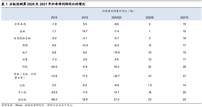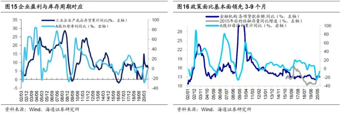 明年宏观流动性比今年整体偏紧,市场走势关键在于基本面。对于明年基本面的判断,我们认为主要考察全部A股归母净利润累计的同比增速和ROE(TTM)。我们预计A股净利累计同比增速将持续回升至2021年3季度,ROE持续回升至2021年4季度,因此牛市还在路上。这是源于:一是依据库存周期,本轮补库存周期原本从19年11月启动,期间疫情有所扰动,历史上一轮库存周期平均持续21个月,依次推断这次补库存将持续至21Q3;二是政策时滞,历史上政策面领先基本面3-9个月,我们预计以社融增速、贷款余额增速和M2同比为代表的宏观流动性指标拐点可能在21年一季度末二季度初,对应盈利高点21Q3前后。