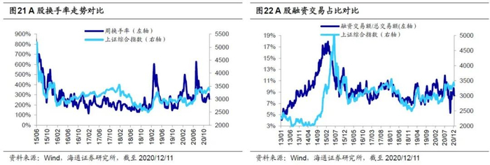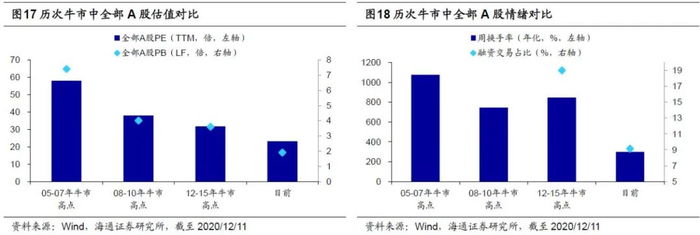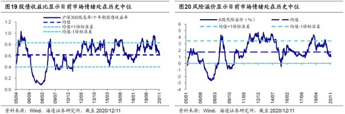 情绪面:牛市后期情绪升温,资金流入加速,微观流动性充裕。前文我们提到A股业绩向好驱动市场继续走牛,除此之外,情绪面是也是影响市场的重要因素。我们主要通过观测各类情绪指标来给A股量体温,整体来看,我们的结论是,假设牛市顶点市场情绪为100度,当前市场大概在60度,往后看市场情绪大概率还可继续升温。主要从三个角度来跟踪:第一是PE/PB,目前(截止2020/12/11,下同)全部A股PE22.5倍/PB 1.85倍,处05年来从低到高72%/35%历史分位,沪深300 PE 15.0倍/PB 1.61倍,处05年来从低到高66%/39%历史分位;第二是大类资产比价,目前股债收益比为0.64,处在05年以来由高到低52%的分位。从风险溢价率看,目前全部A股PE倒数与十年期国债收益率之差为1.16%,对应05年以来由高到低69%分位。第三是换手率和融资交易占比,最近一周全部A股的周换手率为260%,处在历史上由低到高50%的分位,目前融资交易占比为8.4%,对应12年以来从低到高33%分位。