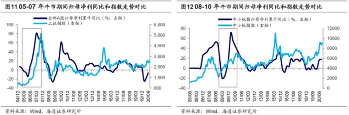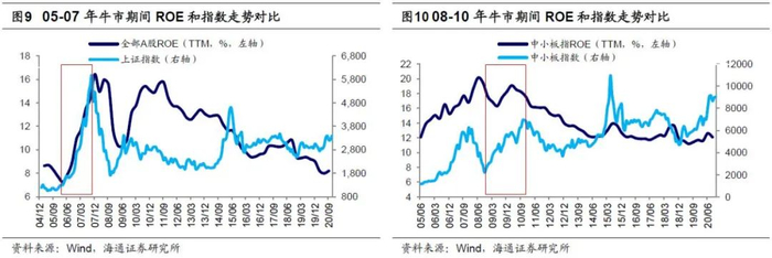 08-10年牛市中,中小板指单季度的归母净利润同比增速高点是09Q4的85%(08Q4低基数),但累计同比增速在10Q1-Q3均维持在50%以上的高位,随后才拐头向下,ROE则在10Q3前均保持在18%以上的高位,而指数的高点为10/11的7493点。