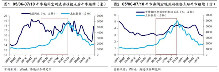 一般来说,流动性指标可以从量、价两个角度衡量,量的指标包括:社融存量增速、M2增速、贷款余额增速;价的指标包括:十年期国债收益率、R007利率、加权平均贷款利率、LPR利率、银行理财利率、非证券投资类信托产品利率。在此我们选取M2同比、十年期国债利率两个代表性指标分析过往三轮牛市中,宏观流动性拐点与股市拐点的关系。