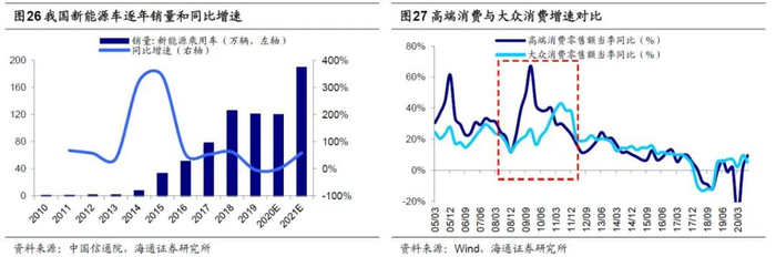 明年行业配置的第二梯队是内需:“十四五”规划《建议》再次强调构建“双循环”新发展格局,提出形成强大国内市场,将扩大内需作为战略基点。展望明年,大众消费有望崛起。回顾08年金融危机历史经验,货币宽松、四万亿等刺激政策推出后,高收入人群首先受益,08Q4-09Q2城镇居民人均可支配收入增速分别高于农村居民家庭人均现金收入增速的6.0%/1.6%/1.9%,这一阶段汽车、家电等耐用消费和高端白酒等可选消费行业需求旺盛,珠宝、化妆品、汽车等高端消费增速迅速上升;09Q3起随着基建、房地产投资落地和制造业、服务业用工需求扩张,农村居民收入增速逐渐超过城镇居民,粮油、食品、饮料等大众消费增速顺势崛起。今年以来,城镇居民收入受到疫情的影响较小,而农村居民特别是外出务工者收入受冲击较大,20Q3城镇居民人均可支配收入同比增5.4%,高于农村外出务工劳动力月均收入增速3.3%,因此今年可选消费品中汽车和高端白酒表现亮眼。借鉴09-10年经验,预计乳制品、餐饮、超市等大众消费需求或将大增。此外,随着收入水平的增加和健康意识的提升,预计专科医院、高端医疗器械、医疗美容、养生保健等医疗服务领域需求也有望提升。