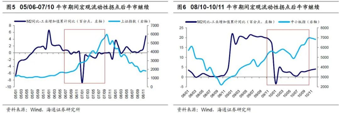 08/10-10/11牛市期间,M2同比在09/11达高点29.7%,M2同比与工业增加值累计同比的差值在09/01冲高,此后维持在20个百分点左右,直到09/11开始步入下降趋势。期间中小板指从09/11/01的4710点升至10/11/10高点7493点,累计涨幅达59%。