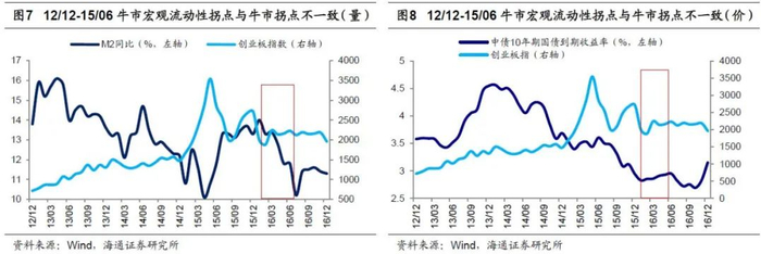12/12-15/06牛市后期,宏观流动性非常充裕,M2同比从15/04开始筑底回升,在16/01达高点14.0%,M2同比与工业增加值累计同比的差值在15/01开始筑底回升,16/01达高点8.3个百分点。然而,15年下半年A股却大幅回调,期间创业板指最大跌幅达56%,主要是源于15年4月起监管层开始清查配资,15年6月12日证监会发文严打场外配资,清查券商违规接入系统,由此触发场外配资去杠杆,微观流动性遭到破坏,可见宏观流动性拐点和牛市拐点变化趋势并不一致。