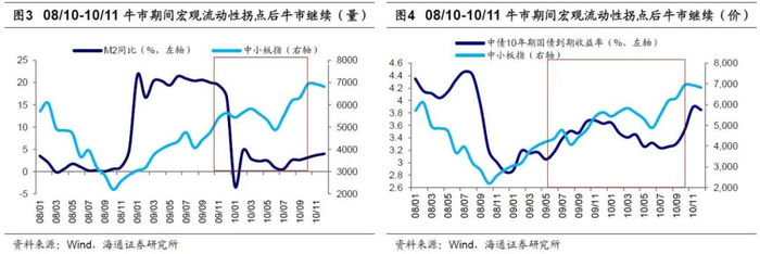 08/10-10/11牛市期间,10年期国债到期收益率在08/12达低点2.85%,此后一直在3%左右筑底,直到09/05开始步入上行期,期间中小板指从09/05/01的4048点升至10/11/10高点7493点,累计涨幅达85%。