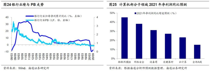 中短期继续关注后周期的金融补涨机会。《牛市扩散——2020年中期A股投资策略-20200705》中我们就分析过,上半年创业板指表现强源于基本面没受到疫情冲击,先进入资金面+基本面驱动的牛市爆发期,下半年疫情得到控制,主板基本面好转,也将进入资金面+基本面驱动的牛市爆发期,扩散即是此含义,并且指出扩散分两步走,3季度汽车家电代表的早周期,4季度金融地产代表的后周期。3季度早周期行业已经崛起,4季度后周期正在发力,而资源股和金融股都属于后周期。资源股的持续性还需看全球需求复苏后续如何。相比之下,金融确定性更高一点,因为目前大金融板块整体涨幅低、配置低、估值低、基本面回升。银行、保险、券商20Q3单季度/20年上半年归母净利润同比增速分别为-4%/-9%、24%/-39%、73%/26%。有投资者对金融估值修复行情颇有疑虑,担心修复空间不大。我们以银行为例回顾历史做一个大致的测算,申万一级行业中的银行指数目前PB(LF)仅0.71倍,12年底至13年初银行PB从低点1.07倍升至高点1.38倍,PB提升了28%,14年底至15年初银行PB从低点0.84倍升至高点1.25倍,PB提升了49%。银行行业ROE下行的趋势中,估值中枢下移很正常,但目前银行PB毕竟才0.71倍,如果修复至0.9-1倍附近,空间也很可观。