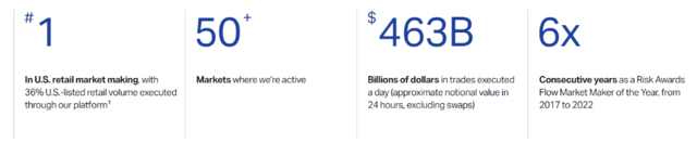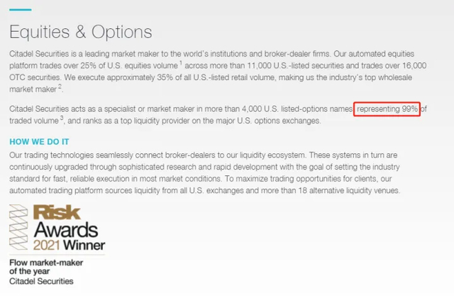 截至去年,Citadel Securities 为4000多家美国上市期权公司提供做市业务,占美国期权交易总量的99%,是业内当之无愧的“王者”;目前,36%的美国上市零售交易都通过 Citadel Securities 的平台执行。