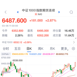 截至2025年3月6日,11:30,股指期货早盘收盘全线大涨,沪深300股指期货(IF)主力合约涨1.55%,上证50股指期货(IH)主力合约涨1.58%,中证500股指期货(IC)主力合约涨2.17%,中证1000股指期货(IM)主力合约涨2.87%。