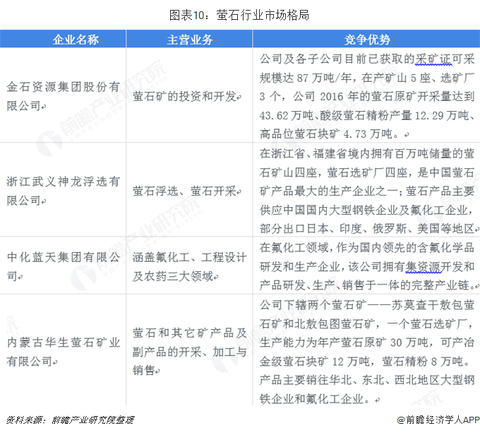 除区域格局外,我国萤石行业在企业竞争格局上也存在明显的特点。我国的萤石行业企业以民营企业为主,总体呈现企业规模普遍较小、经营管理较为粗放、行业集中度不高的特点。规模较大且在行业内具有较大影响力的萤石采选企业仅几家,集中分布在浙江、江西、内蒙古、湖南等萤石资源大省,以金石资源集团股份有限公司、浙江武义神龙浮选有限公司、中化蓝天集团有限公司和内蒙古华生萤石矿业有限公司为代表,均为民营企业。