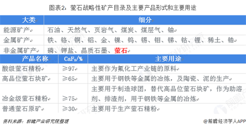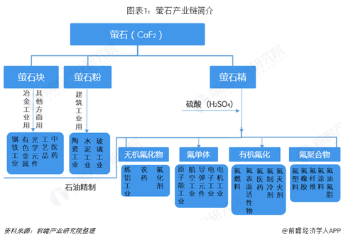 萤石属于非金属矿产,主要产品形式有酸级萤石精粉、高品位萤石块矿、冶金级萤石精粉与普通萤石原矿四类。其中,酸级萤石精粉主要与硫酸反应生产氢氟酸,为氟化工下游产品的制造提供原料。
