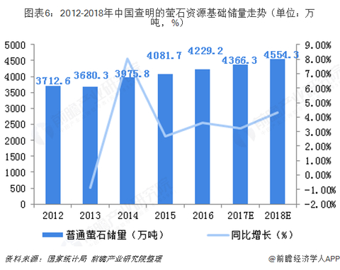 在萤石资源基础储量方面,近年来,我国查明的萤石资源基础储量不断增加,增速趋于平稳。根据国家统计局和国土资源部的统计,2018年我国查明的萤石资源基础储量约为4554.3万吨。主要分布于湖南、浙江、江西、福建、安徽、内蒙古、河北等省区,其中湖南省的资源储量居全国首位。