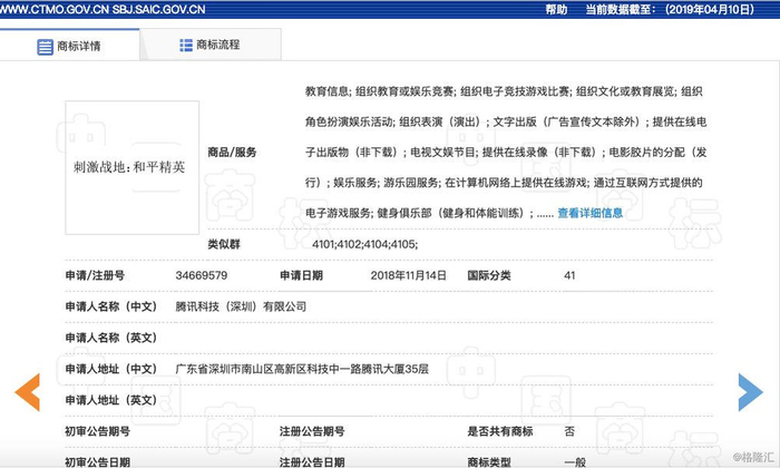竞核(ID:hungrydou)查询中国商标网后,意外地发现,腾讯已经将《刺激战地:和平精英》注册为商标,有9类、41类、42类。时间是去年11月份。