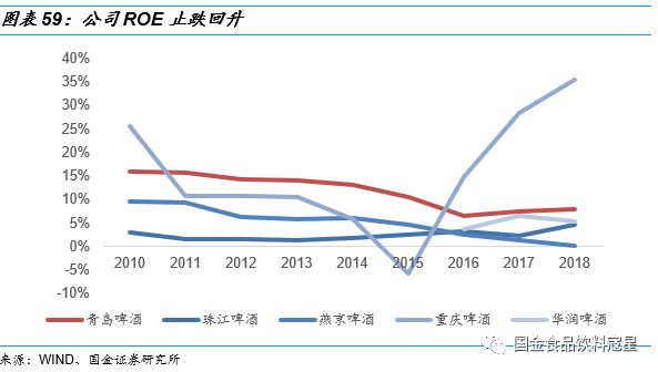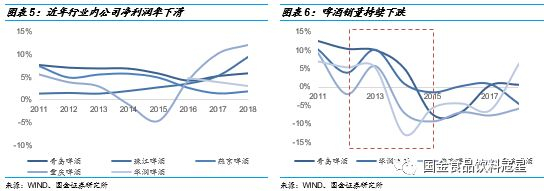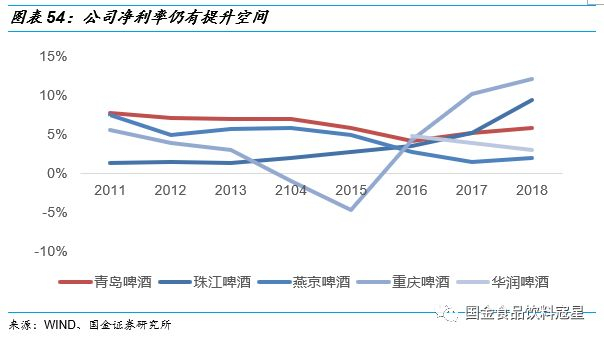 利润水平承压,行业公司亟待新的突破点:2013年产量到达高位开始下跌后,行业内公司的生存压力也开始加大,各公司首先寄希望于“价格战”,提高销售费用率来恢复消费量,因此使得利润端明显承压。2014-2016年之间青岛啤酒、燕京啤酒、重庆啤酒等公司净利润率水平都出现了不同程度的下跌,几家公司的净利率水也平均跌到5%以下,各企业的roe也在持续走低,面临较大的经营压力。