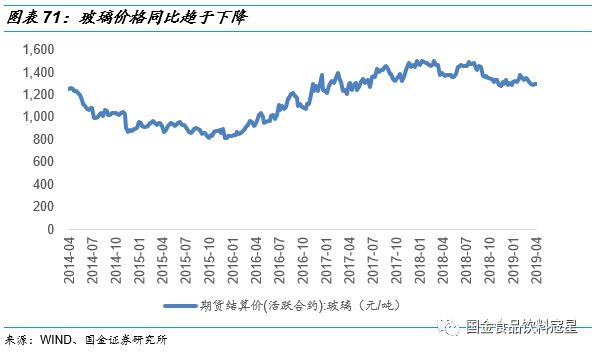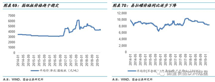 环保税实施一年后包装纸价格企稳,易拉罐和玻璃出现下降趋势:纸类生产制造企业由于污水排放等原因近几年在环保等方面面临较大压力,2018年1月实施的环保税法更是直接迫使各大制造企业成本上涨。包装纸价格2017年开始持续上涨,最高的时候单价超过6000元\/吨,近期来看箱纸板价格趋于稳定,各企业也逐渐从这一轮环保整改危机中走出,未来预计价格将企稳。易拉罐和玻璃等包装材料价格也自2017年开始不断上涨,2019年一季度价格相较于2018年同期出现下降趋势,原材料价格压力也将逐步缓解。
