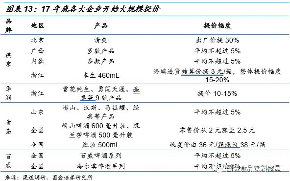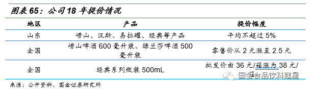 18年两次大规模提价,未来将是重要的战略手段:为了应对原材料价格上涨的压力,公司在18年初和年中分别进行了两次大规模的提价,经典系列、崂山、汉斯、绿兰莎等系列出厂价和零售价均进行了上调,其中将崂山啤酒600mL装和绿兰莎啤酒500mL装零售价从2元提升至2.5元,将经典系列瓶装500mL批发价由36元\/箱涨为38元\/箱。2018年在整体提价的背景下公司产品总销量仍实现0.76%的增长,并且主品牌销量增长3.97%,高于整体增速,此次提价较为顺畅,实现了从厂家到经销商到终端的顺利传导。未来提价仍将是公司重要的战略手段,分地区,分产品去逐步执行,根据各地区实际情况进行更有效的提价,逐步提升青岛啤酒的平均售价。